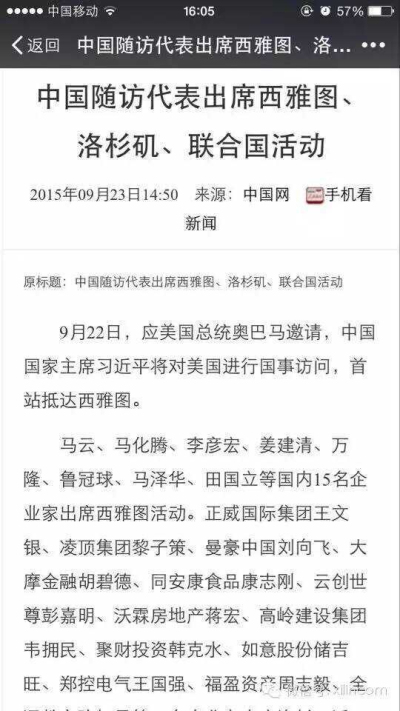 馬云、馬化騰、李彥宏、姜建清、萬隆、魯冠球、馬澤華、田國立等國內15名企業家出席西雅圖活動。正威國際集團王文銀、凌頂集團黎子策、曼豪中國劉向飛、大摩金融胡碧德、同安康食品康志剛、云創世尊彭嘉明、沃霖房地產蔣宏、高嶺建設集團韋擁民、聚財投資韓克水、如意股份儲吉旺、鄭控電氣王國強、福盈資產周志毅、全通教育陳熾昌等30名企業家出席洛杉磯活動,美國國會、各州市長100余人共同歡迎中國企業代表團。