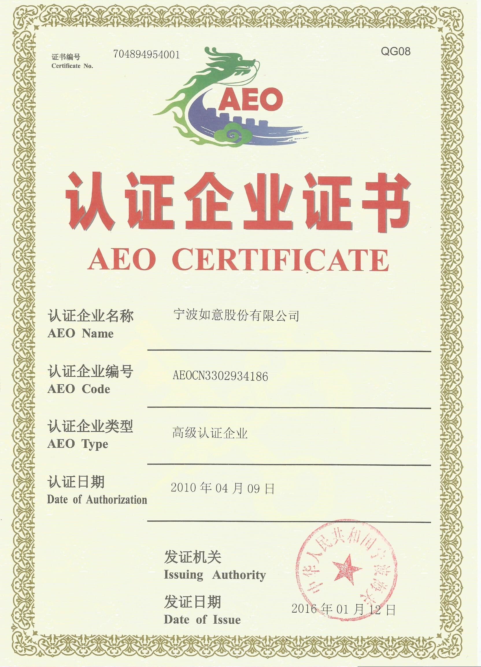 我公司榮獲寧波海關授予的海關認證證書